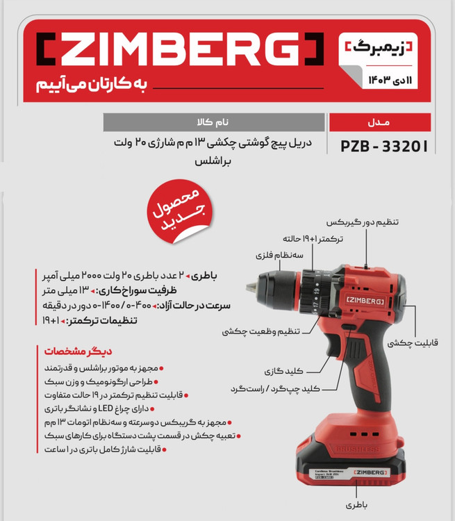 دریل پیچگوشتی چکشی ۱۳م م شارژی ۲۰ ولت براشلس زیمبرگ PZB-3320I