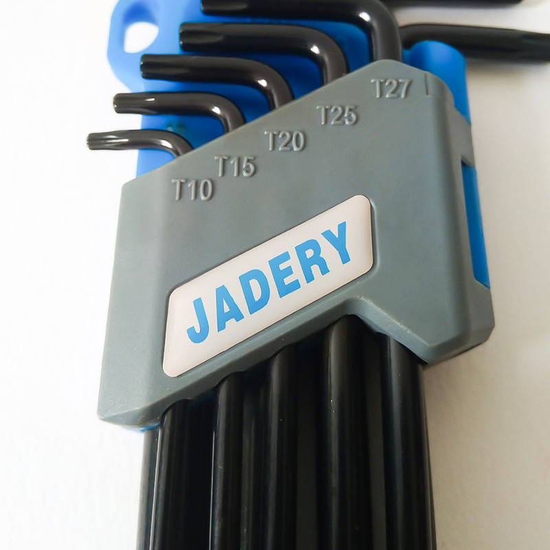 کمپانی جادری (JADERY) از سازنده های خوش نام ابزارآلات دستی در کشور تایوان می باشد . مجموعه 9 عددی آلن کد 550 از محصولات جادری می باشد که از 9 آلن ستاره ای گوش در سایزهای T10 تا T50 تشکیل شده است . این مجموعه از با دوام ترین آلیاژ فولاد کروم وانادیوم ساخته شده است تا دوام بسیار بالایی را از خود نشان دهد . تمامی این آلن ها روی هلدری زیبا و با دوام قرار گرفته اند
